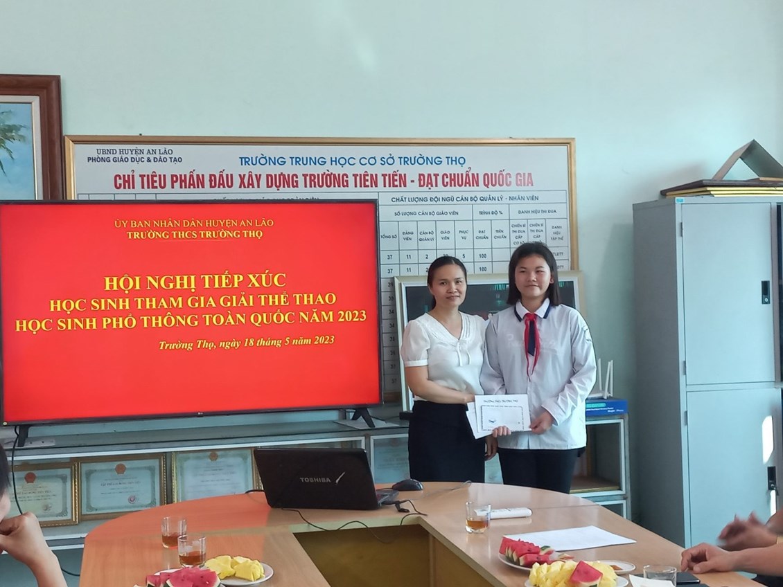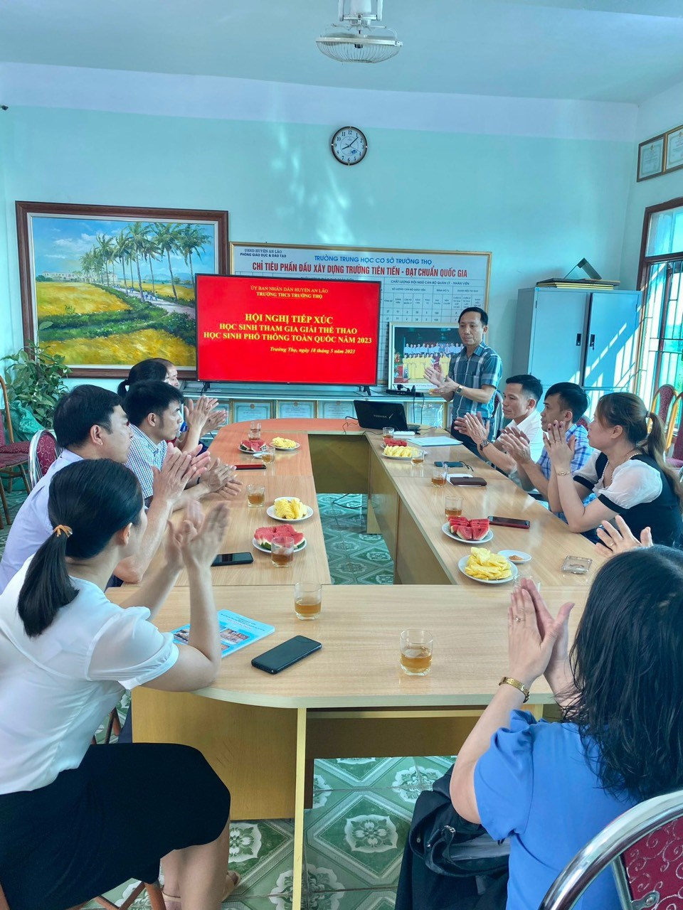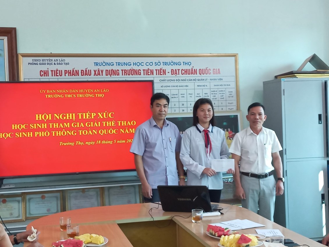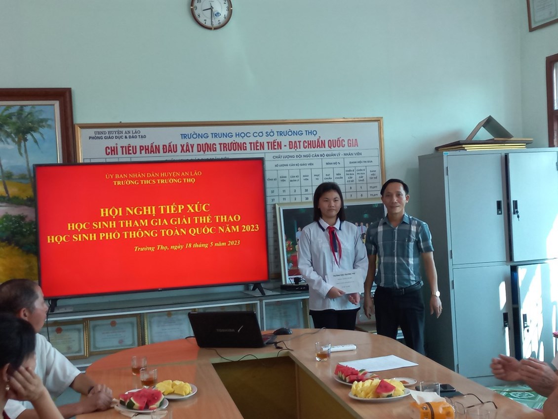 Sáng nay ngày 18/5/2023 trường THCS Trường Thọ tổ chức Hội nghị tiếp xúc học sinh tham gia thi giải thể thao học sinh phổ thông toàn quốc năm 2023. Trường THCS Trường Thọ xin được cảm ơn các đồng chí lãnh đạo Đảng ủy- HĐND- UBND-UBMTTQ, Hội khuyến học xã Trường Thọ, Hội cha mẹ học sinh đã đến dự và có quà động viên học sinh. Chúc học sinh Nguyễn Tuyến Anh lớp 7C của trường tham gia thi đấu đạt giải cao!