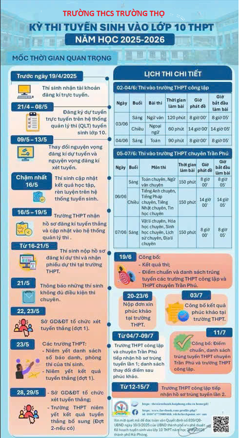 THÔNG TIN: các mốc thời gian đăng ký dự thi; lịch thi vào lớp 10 THPT năm học 2025 - 2026 của thí sinh dự thi tại thành phố Hải Phòng, các phụ huynh và các em học sinh cần lưu ý đăng ký, làm thủ tục đúng hạn đăng ký dự thi và dự thi vào 10 theo lịch!